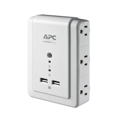 Protect your electronic devices from power surges and spikes with this APC Essential SurgeArrest 6-Outlet Wall Mount with USB. Its state of the art technology protects from damage resulting from larger power surges and more common power fluctuations. This wall-mount surge protector has two 2.4A USB charging ports for your mobile devices, as well as LED status indicator lights. A Building Wiring Fault indicator lets you know if there is a risk of dangerous wiring problems in the circuitry of the wall.